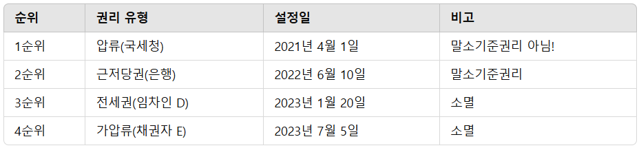 이 경우, 근저당권(2022년 6월 10일 설정)이 말소기준권리가 된다. 따라서 이후에 설정된 전세권과 가압류는 모두 소멸한다. 하지만 압류(2021년 4월 1일)는 말소되지 않는다.